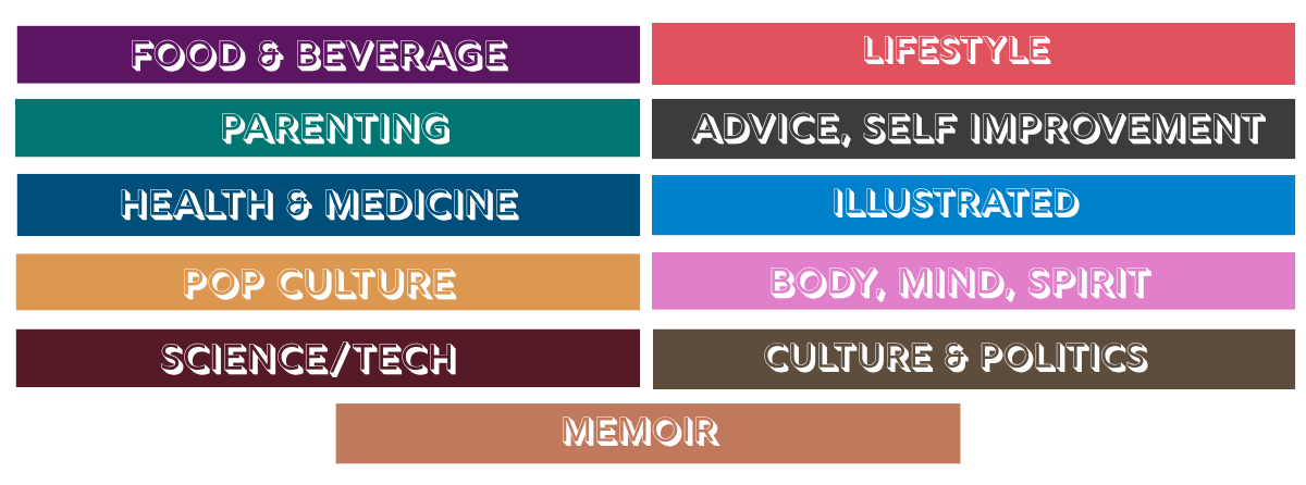 See below for a partial list of clients, organized alphabetically, color labeled by category of nonfiction book, with their publisher listed below.